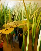 Um 13 Uhr waren wir dann aber alle wieder vollständig versammelt, um im Restaurant „Längengrad“ ein sehr üppiges und gutes Mittagsbüffet zu genießen. Gestärkt ging es nun in 5 Gruppen und jeweils einem Scout auf Reisen. Wir folgten dem 8. Längengrad Ost in Bremerhaven auf den Bahnschienen bis nach Isenthal im Kanton Uri der Schweizer Alpen, wo die Kuh gemolken und die Kuhglocken geschwungen werden konnten. Nach einem kurzen Anstieg in den Bergen gelangten wir nach Seneghe in Sardinien. Dies erlebten wir aus der Perspektive eines Insekts. Weiter ging es nach Kanak in Niger, um einen Tag in der Sahelzone zu verbringen. Wir kamen nach Ikenge in Kamerun, wo die Mutigen unter uns, den Weg über die Wackelbrücke nahmen, um den Regenwald bei Nacht zu durchwandern. Und dann kam die ersehnte Abkühlung nach Hitze und Schwüle – wir besuchten eine Polarstation in der Antarktis. Doch Eis und Schnee konnten uns nicht davon abhalten, auch noch dem Südseeparadies Satitoa einen Besuch abzustatten. Wir chillten am Strand und gingen durch eine wundervolle Wasserwelt mit Korallenriffen und schillernden Fischen.