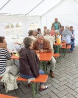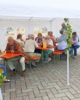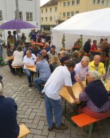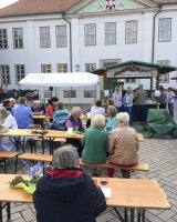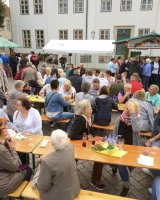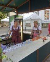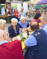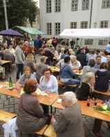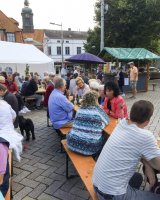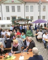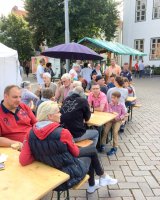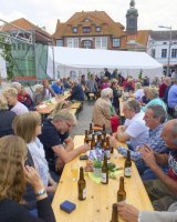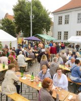 Mit rund 15 Vereinsmitgliedern wurde aus dem Marktplatz eine gemütliche Weinstube vor der Kulisse des historischen Kreishauses. Acht verschiedene Weinsorten sowie Bier und Softgetränke hielt der Verein für die Besucher vor, während die Jugendfeuerwehr Ratzeburg für Grillwurst sorgte.