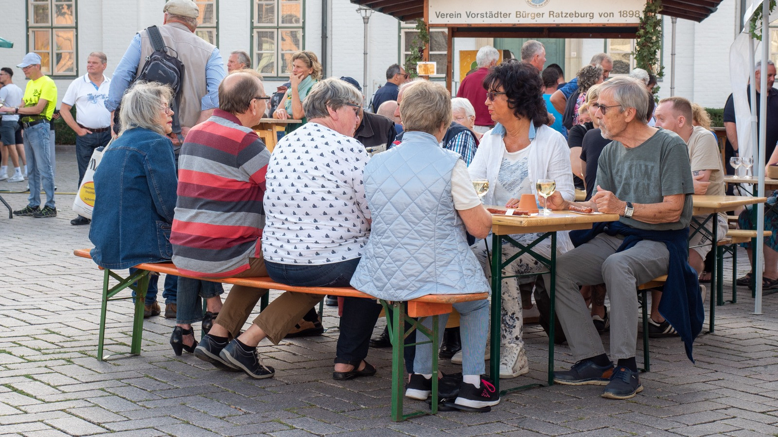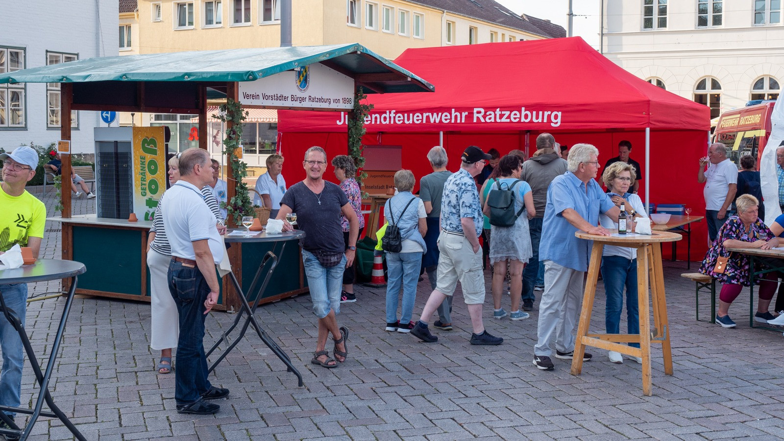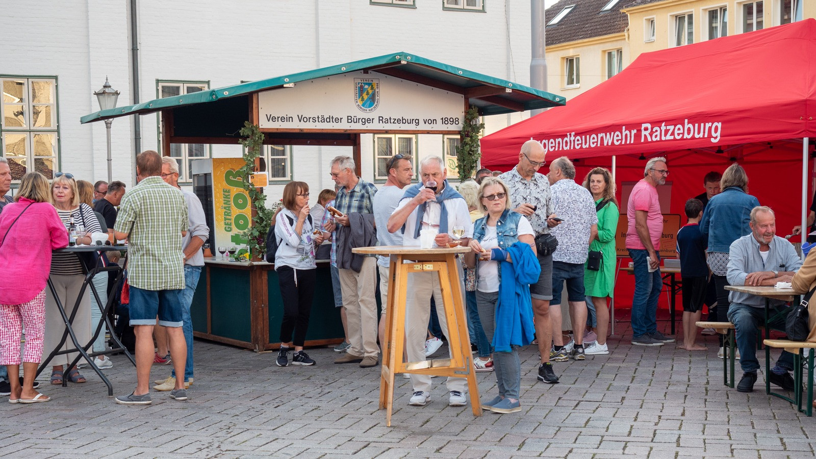 Zum Wohle: Am 20. August lud der Verein „Vorstädter Bürger Ratzeburg von 1898 e. V.“ zum achten Ratzeburger Weinfest ein. Um 17 Uhr begann der gesellige Umtrunk auf dem Ratzeburger Marktplatz, der bis etwa 23 Uhr andauerte. Das Angebot hatte für jeden Gaumen etwas parat: ganz gleich, ob weiß, rot oder rosé - ganz gleich, ob kritischer Connaisseur oder eher seltener Verkoster des vergorenen Rebensaftes. Für die nötige Substanz sorgten frische Brezen. Und wer mit dem bacchischen Genuss nun wirklich nichts anfangen konnte oder noch fahren musste, für den wurden auch Softdrinks ausgeschenkt.